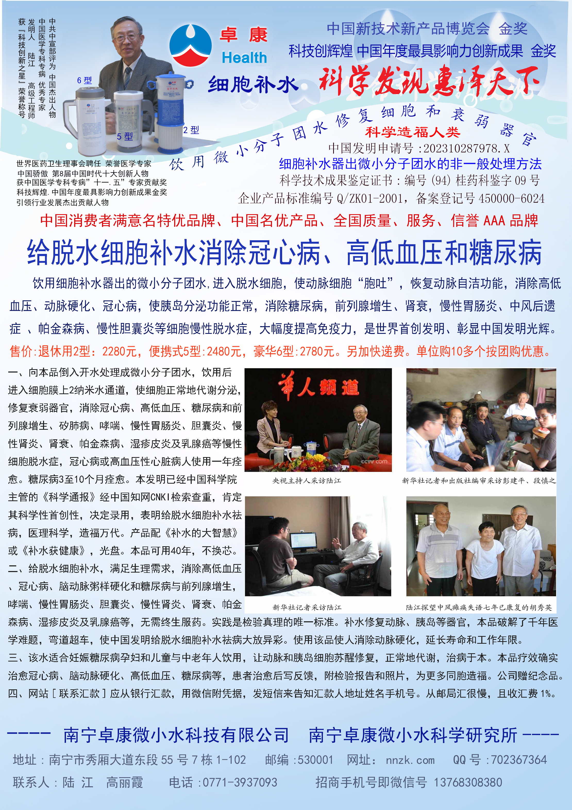 人類幾千年來患以上病癥需終生服藥,幾十年也不能治愈。可是我國南寧的高級工程師陸 江,于1990年想根治高血壓,研究發(fā)明了離子水瓶,處理出微小分子團水供飲用,經(jīng)過醫(yī)院臨床試用和專家鑒定,1999年獲中國發(fā)明專利權(quán),產(chǎn)品于2000年投放市場后一直跟蹤調(diào)查,據(jù)全國各地用戶反饋:祛除了高低血壓、糖尿病和冠心病,并使前列腺增生、咽喉炎、鼻竇炎、慢性氣管炎、支氣管炎、矽肺病、哮喘、慢性胃炎、腸炎、慢性膽囊炎、慢性腎炎、腎衰、膀胱炎、便秘、痔瘡、風(fēng)濕性關(guān)節(jié)炎和濕疹皮炎及中風(fēng)后遺癥等病癥不藥而愈。為什么喝微小水能治20多種病?陸 江從1991年德國科學(xué)家發(fā)現(xiàn)細胞膜水通道僅為2納米獲得啟發(fā),認(rèn)為多種器官患病是因細胞脫水,不能正常代謝和分裂增殖,才使器官細胞減少致衰弱萎縮而形成細胞缺水性病癥。22年來的實踐有力地支持了“細胞脫水致病”這一重要論點,表明喝微小水可滿足細胞的生理需求,補水就能祛病,是生命科學(xué)新亮點。
