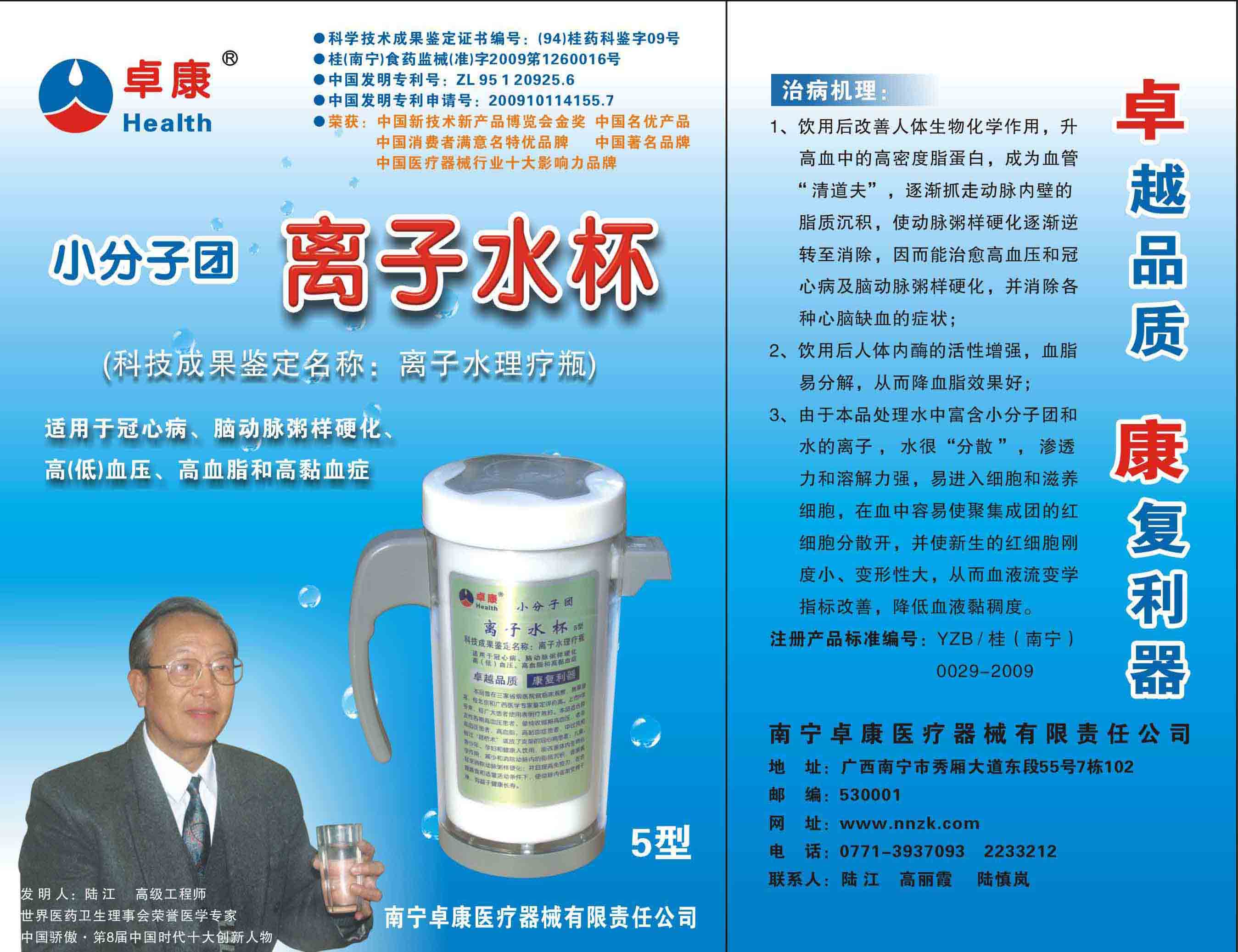 本品大量用戶的使用效果表明,能治愈冠心病、腦動脈硬化、原發(fā)性高(低)血壓、高血脂、高粘血癥、高血尿酸癥(痛風(fēng))和2型糖尿病、衰弱器官并發(fā)癥(前列腺增生、腎衰與尿毒癥)及中風(fēng)后遺癥等療效好。產(chǎn)品配信譽卡。使用壽命30年,不換芯,易清洗。團購優(yōu)惠。從郵局匯款,匯費1%,地址按本頁下方地址、聯(lián)系人寫。從銀行匯款,請點擊[聯(lián)系匯款]欄,從工商銀行匯款,建設(shè)銀行、農(nóng)業(yè)銀行匯款,均免收匯費,匯款后20--30分鐘內(nèi)發(fā)短信,可用微信轉(zhuǎn)帳,均免匯費,微信號即手機號13768308380。匯款后,告知你的姓名和地址,我公司聯(lián)系人手機號是:13768308380卓康牌離子水瓶為我公司獨家生產(chǎn),郵購產(chǎn)品配《補水的大智慧》彩印書一本,另配四季出版社出版的新書《補水的大智慧》一本,并配光盤一張(含央視主持人釆訪陸江的對話視頻)。目前市場和"淘寶網(wǎng)"上有人兜售假冒的偽品,望讀者審察辯別真?zhèn)危旒僬哓飧`假冒本公司的各種認(rèn)證、獲獎獎項、專利號和外包裝盒上的中英文字,包括科技成果的鑒定意見等,請讀者注意防偽。如何識別假貨?已經(jīng)買了假貨怎么辦?(請點擊[打假掠影][打假掠影])。